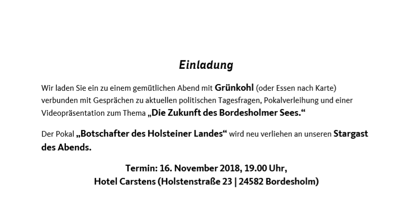 Es erwartet Sie ein interessanter und abwechslungsreicher Abend. Das Restaurant serviert den Grünkohl satt für Sie zum Preis von 15,00 € inkl. einem Schnaps.